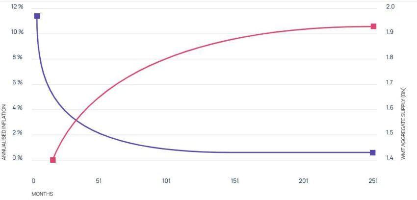 ويحصل مشغلو العقد رسوم المعاملات بالرمز $WMT والذي تتم مشاركته مع المستثمرين من مالكي الرمز في عقدهم، أما فيما يخص مكافأة التضخم فقد احتفظت الشركة بنسبة 29٪ من إجمالي المعروض من الرموز للمتعهدين ومشغلي العقد.