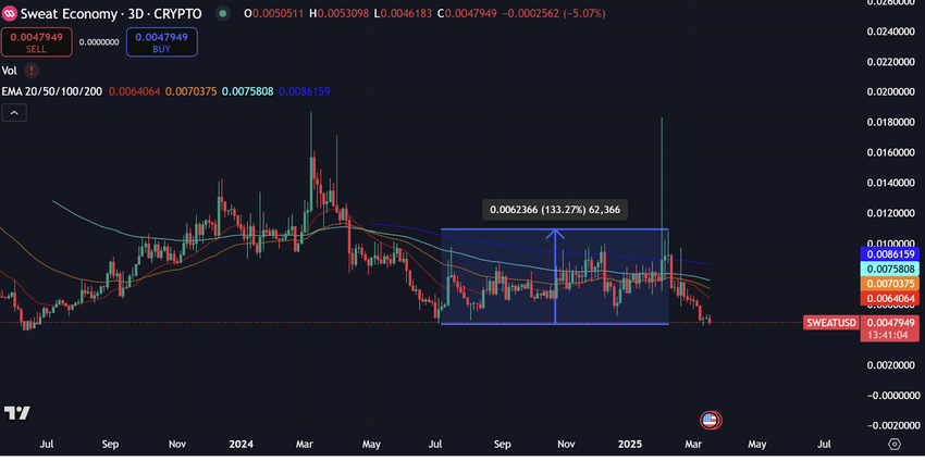 بدأت عملة SWEAT عام 2024 بآداء جيد جدا مثلها مثل بقية العملات الرقمية. فبعدما تم قبول صناديق بيتكوين الإستثمارية مثل هذا فرصة ممتازة لشراء العملات الرقمية والرهان على زيادة قيمتها في المستقبل وقد حدث هذا بالفعل ولكن في الربع الأول من 2024 فقط. وصل سعر SWEAT إلى 0.02$ تقريبا على بعض المنصات ولكن فشلت في الصعود أكثر من هذا وبعدها تعرضت إلى تصحيح سعري عنيف جدا. إستمر هذا التصحيح على طوال عام 2024 وظلت العملة في معاناه شديدة حتى الربع الأخير من السنة. إنتعش السوق مرة أخرى ومعه عملة SWEAT ولكن هذه المرة لم تكن الإنتعاشة قوية على الإطلاق. فقد وصل عدد العملات البديلة في الأسواق إلى أرقام ضخمة تفوق مليون عملة وبالتالي لم تكن هناك سيولة كافية من أجل تحريك السوق كله. وكانت عملة SWEAT من العملات التي تم تجاهلها في موجة الصعود تقريبا ولم تنجح في تحقيق مكاسب قوية.