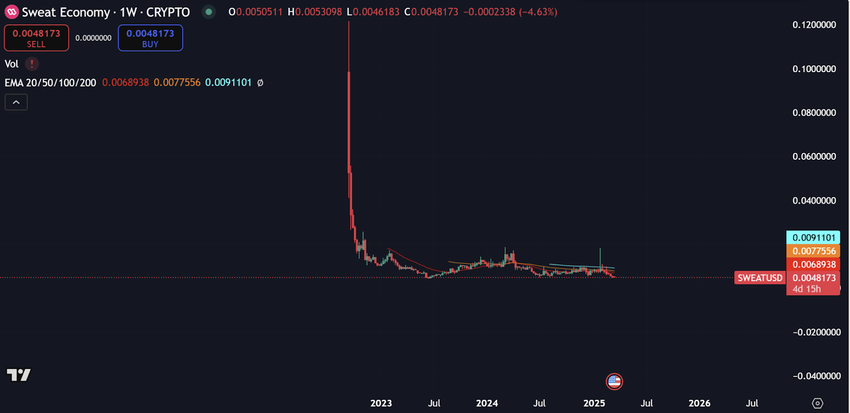 إذا نظرنا للرسم البياني الأسبوعي للعملة سنلاحظ المقصود. لاحظ أنه من تاريخ إطلاق العملة وحتى الآن وسعر SWEAT في هبوط عنيف نتيجة لأمرين، الأول هو التضخم العنيف الذي يزيد من عدد العملات المطروحة في الأسواق والثاني هو ضغط البيع الشديد الناتج من كل من يقوم بتعدين العملة.