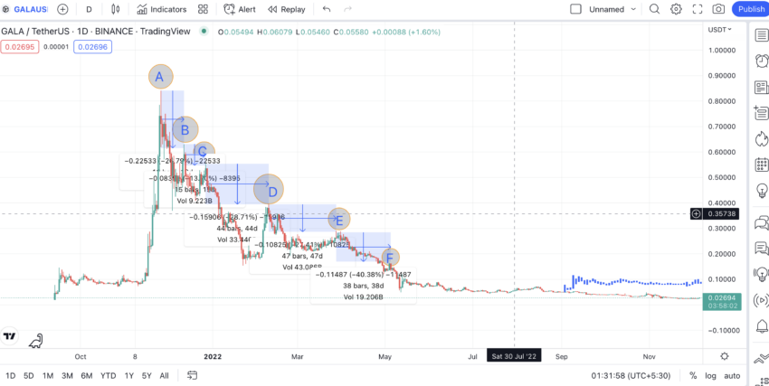 وإذا اتبعت عملة GALA نمط foldback/mirror يبدأ الجزء التالي من الارتداد القابل للطي الخاص بالعملة في منتصف مايو آخر ارتفاع أو النقطة F وديسمبر، لتكون البداية المثالية للعملة في منتصف سبتمبر.