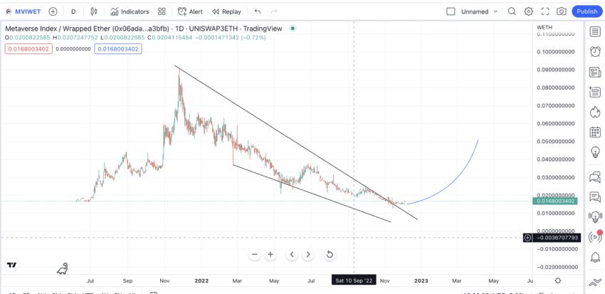 وثمة وجود للإيثر المغلف بمؤشر الميتافيرس داخل منصة Uniswap، كما يمكن للمستخدم رؤية وتد هابط واختراق سعري عند خط الاتجاه العلوي، ومع استمرار هذا النمط يمكن توقع اتجاه سعري مرتفع للعملة.