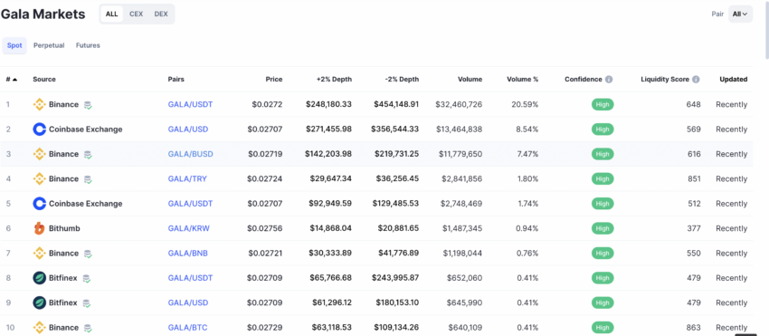 وثمة إيجابيات تكمن في انتشار أسواق التداول الفوري ذات السيولة الفائقة ودرجات الثقة المرتفعة، لذا فقد انتشر زوج GALA-USDT كما أصبحت العملة قابلة للتداول في البورصات اللامركزية وتدعمها في الفترة الحالية منصة SushiSwap.