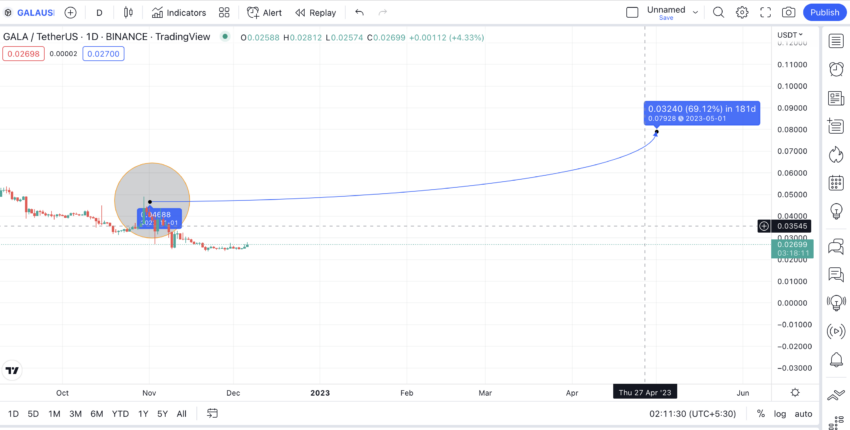 وعلى بورصة بينانس تم التداول لزوج GALA-USDT في سبتمبر 2021 لتكون النقطة المثالية عند تحديد الشكل المرتفع إلى أعلى.
