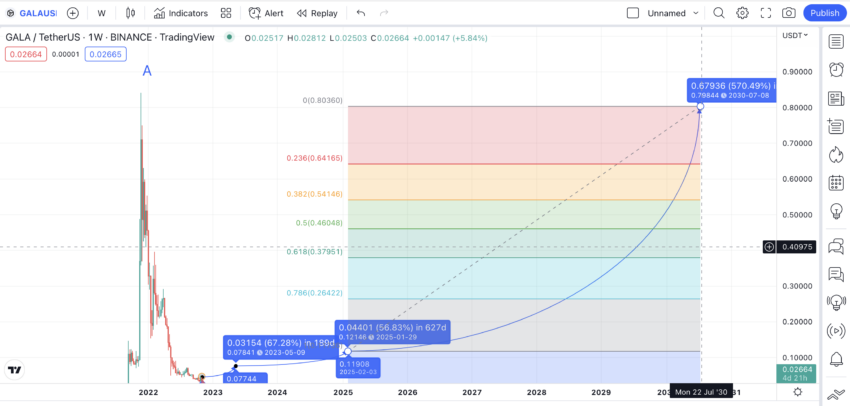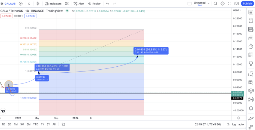 وفي الفترة الحالية، عند قراءة العملة نجدها تتبع نمط نمو خطي ليكون السعر المتوقع خلال عام 2025 هو 0.12146 دولار، كما يمكن تحديد الانخفاضات باستخدام مقياس تصحيح فيبوناتشي لمعرفة اتجاه انخفاض أسعار GALA.