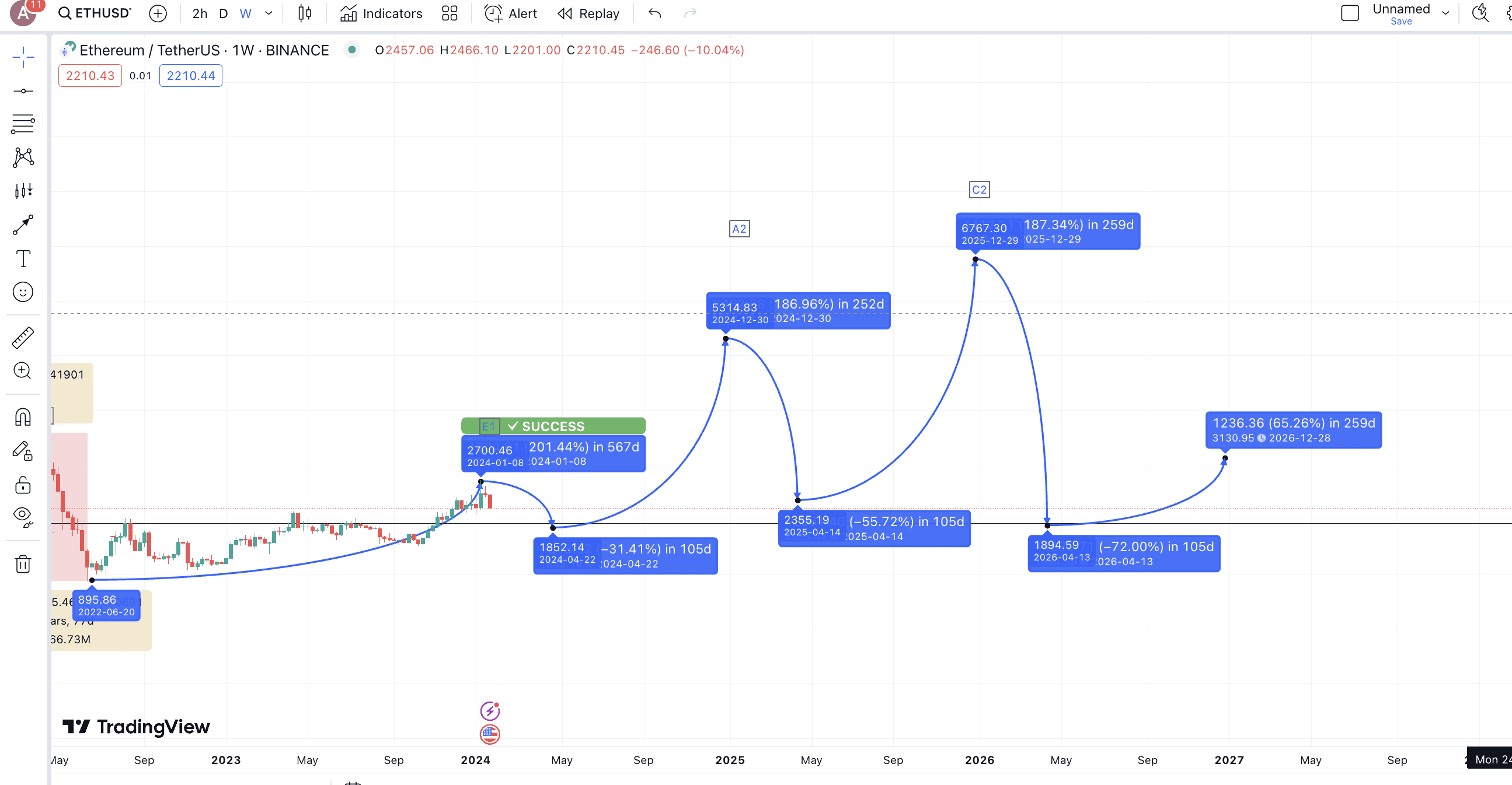 إذا تحقق توقع سعر إيثريوم لعام 2025 ووصل سعر العملة إلى ٦٬٧٦٧$ بحلول نهاية 2025، يمكننا توقع تصحيح أعمق في 2026، بفضل البيع السريع. في هذه المرحلة، يجب أن يكون 100% من حاملي إيثريوم في الربح، مما يجعل 2026 عام التصحيح الأكثر صرامة. من أعلى مستوى سابق أو C2، يمكننا بعد ذلك توقع انخفاض إيثريوم بنسبة 72,036% في 105 أيام، وفقًا لتحديد متوسط السعر لدينا.