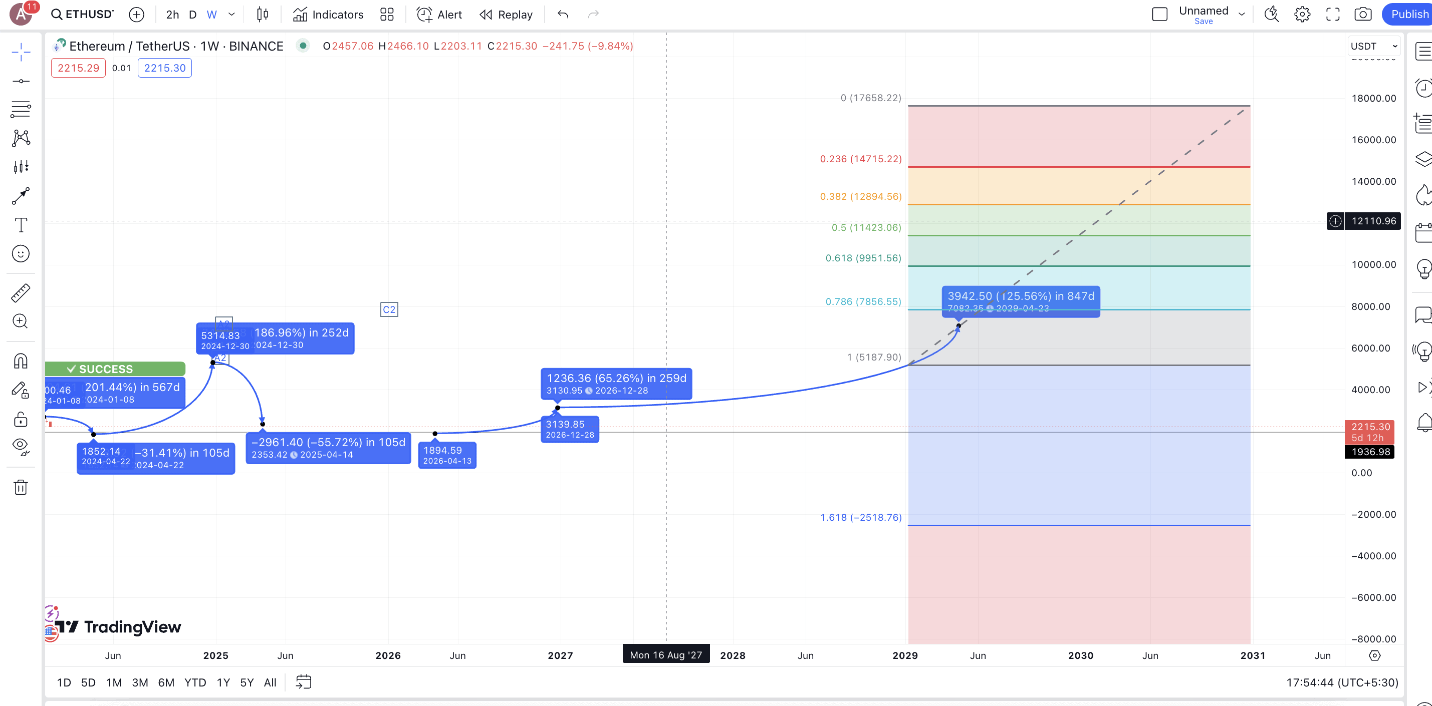 إذا أخذنا في الاعتبار هذه الدورات الصعودية والهبوطية، يجب أن يصل إيثريوم إلى أعلى مستوى له على الإطلاق عند ٧٬٠٨٢$ بحلول نهاية 2029. إذا تم الوصول إلى هذا المستوى، مع توقع أن يتشكل أدنى مستوى لعام 2029 حول ٥٬١٠٠$، يمكننا توقع أن يرتفع سعر إيثريوم إلى ١٧٬٦٥٨$ بحلول 2030.