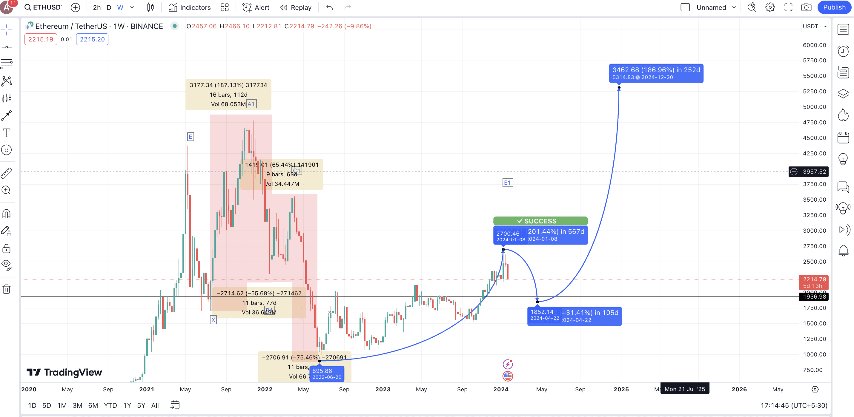 سنناقش في الأقسام التالية الرسوم البيانية الأوسع المرتبطة بسعر إيثريوم. ستكون الفكرة هي تحديد متوسط نسب الأسعار بين الارتفاعات والانخفاضات السابقة لبناء تحليل فني أكثر دقة وتشكيل توقعات سعرية مدعومة بالبيانات لـ ETH. لكن قبل أن نتعمق في الرسوم البيانية الأسبوعية، دعونا نقوم بتحليل فني قصير الأجل لفهم الإمكانات السعرية المستقبلية القريبة لـ ETH.