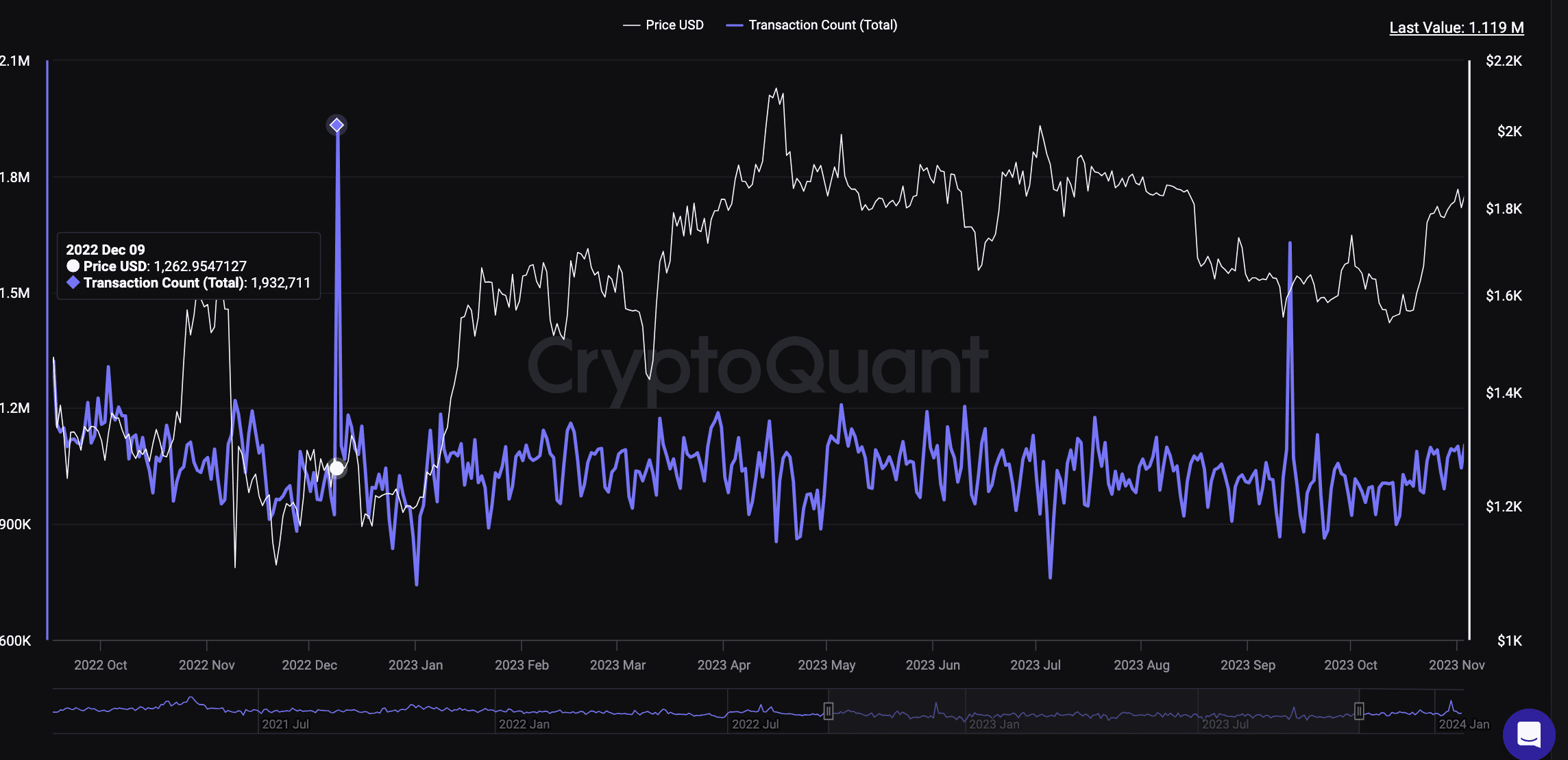 ابدأ هذا القسم بمقياس سريع وهو عدد المعاملات. من الجدير بالذكر أن عدد المعاملات ارتفع بشكل كبير في نهاية 2022، تلاه ارتفاع مذهل في الأسعار في أقل من شهر. بدأ شيء مشابه يحدث في أكتوبر 2024، وبعد ذلك ارتفعت الأسعار.
