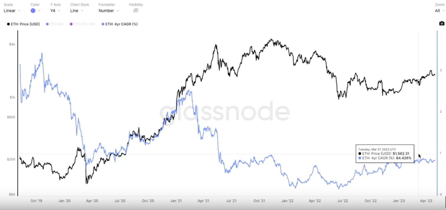 من المعروف أن أكثر الأصول المشفرة أمانًا واستقرارًا هي عملة بيتكوين وعملة إيثيريوم. وبالتالي يمكنك أن تنشىء حسابًا على منصة Glassnode. ومن خلال هذه المنصة ومجانًا يمكنك أن تحصل على مؤشر CAGR.