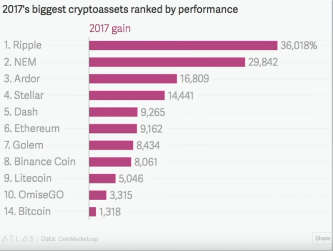 في سوق العملات الرقمية مثلا إذا نظرنا على العملات الرقمية ذات الأداء الجيد في 2017 سنلاحظ الزيادات الجنونية. يمكنك ملاحظة هذه الزيادات بالصورة بالأسفل.