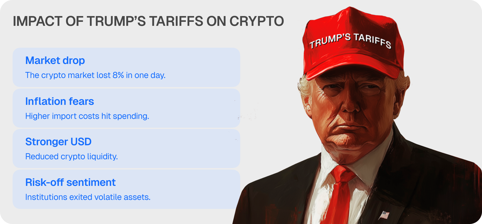 بعد إعلان تعريفات ترامب، تراجعت أسواق العملات الرقمية جنبًا إلى جنب مع الأسهم. انخفضت القيمة السوقية الإجمالية للعملات الرقمية بحوالي 8% في يوم واحد فقط، لتصل إلى حوالي 3,2 تريليون دولار.