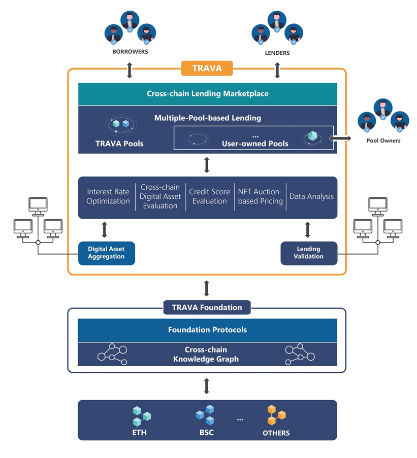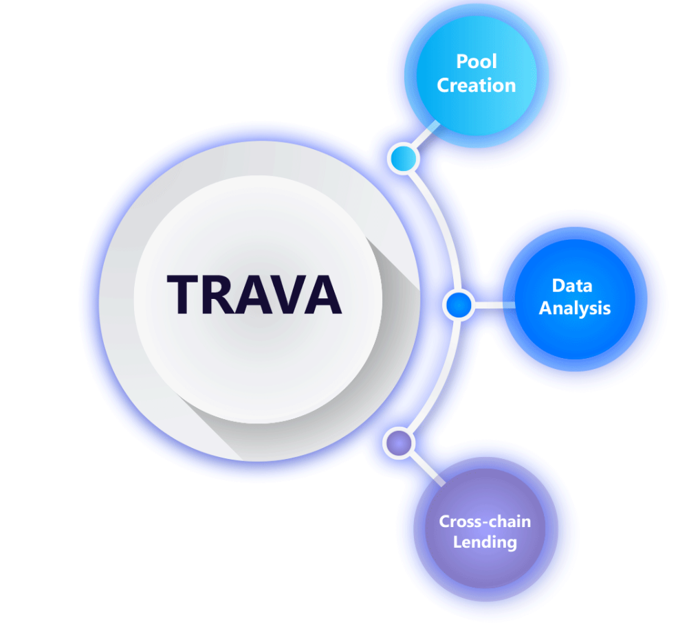 ولكن من خلال مشروع عملة Trava يمكن حل هذه المشكلة. حيث يسعى المشروع إلى خلق تجمعات توافقية تتعامل مع أكثر من بلوك تشين. بهذه الطريقة يمكن مثلا لشخص إقراض أموال موجودة على بلوك تشين بينانس لشخص على بلوك تشين إيثيريوم.