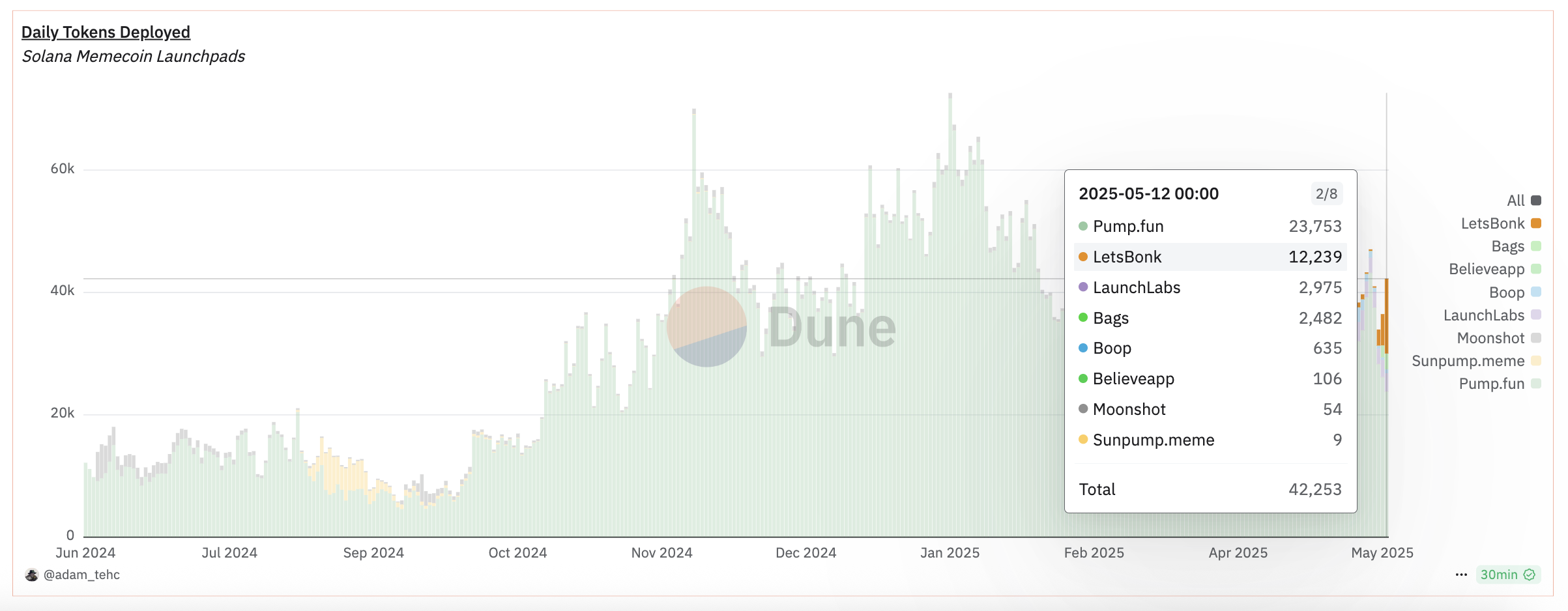 بلغت ذروة PumpFun في 23 يناير 2025، عندما شهدت إطلاق 71,735 رمزًا في يوم واحد - وهو مستوى لم يقترب أي منافس من مطابقته منذ ذلك الحين.