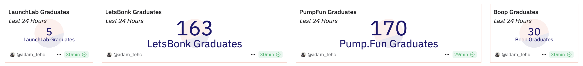 بالمقارنة، كان لدى LaunchLab فقط 5 رموز تخرجت، بينما شهد Boop 30. هذا يظهر أن LetsBonk لا ينمو فقط في الكمية—بل يجذب أيضًا رموزًا ذات تفاعل عالٍ ودعم قوي من المجتمع.