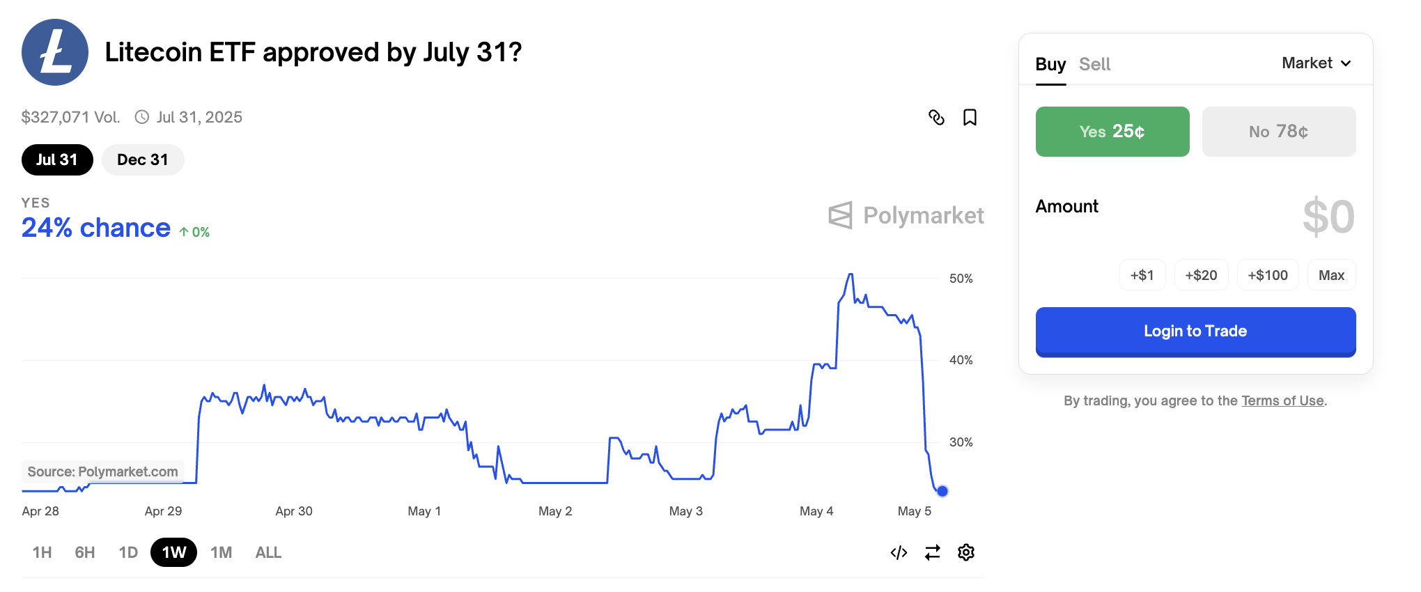 انخفض سعر لايتكوين بسرعة بعد أن أجلت اللجنة هذا الطلب، حيث انخفض بنسبة 5% في أدنى نقطة له. كما انخفضت احتمالات موافقة بوليماركت على صندوق تداول لايتكوين في الربع الثاني من عام 2025، لكن فرص الموافقة في عام 2025 بشكل عام ظلت ثابتة.