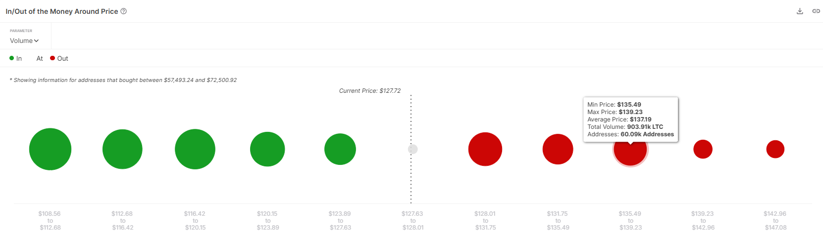 وفقًا لمؤشر In/Out of the Money Around Price (IOMAP)، هناك اهتمام كبير من المستثمرين بين 128$ و139$. اشترى المستثمرون في هذا النطاق حوالي 2,66 مليون LTC بقيمة تزيد عن 337 مليون$. العديد من هؤلاء المستثمرين ينتظرون اختراق مستوى 136$ الحرج لتحقيق الأرباح.