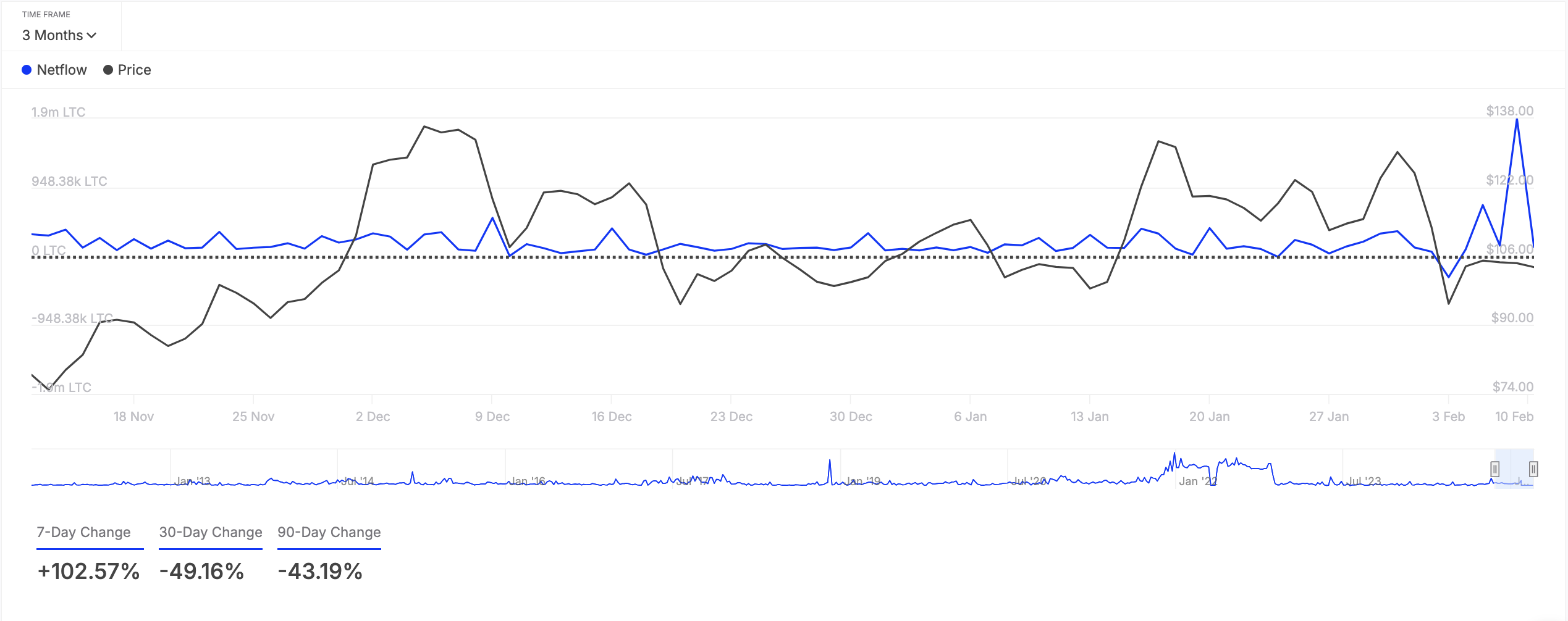 تكشف بيانات السلسلة أن LTC قد شهدت ارتفاعًا ثلاثي الأرقام في صافي تدفق حامليها الكبار خلال الأسبوع الماضي. وفقًا لـ IntoTheBlock، ارتفع هذا بنسبة 103% خلال تلك الفترة.
