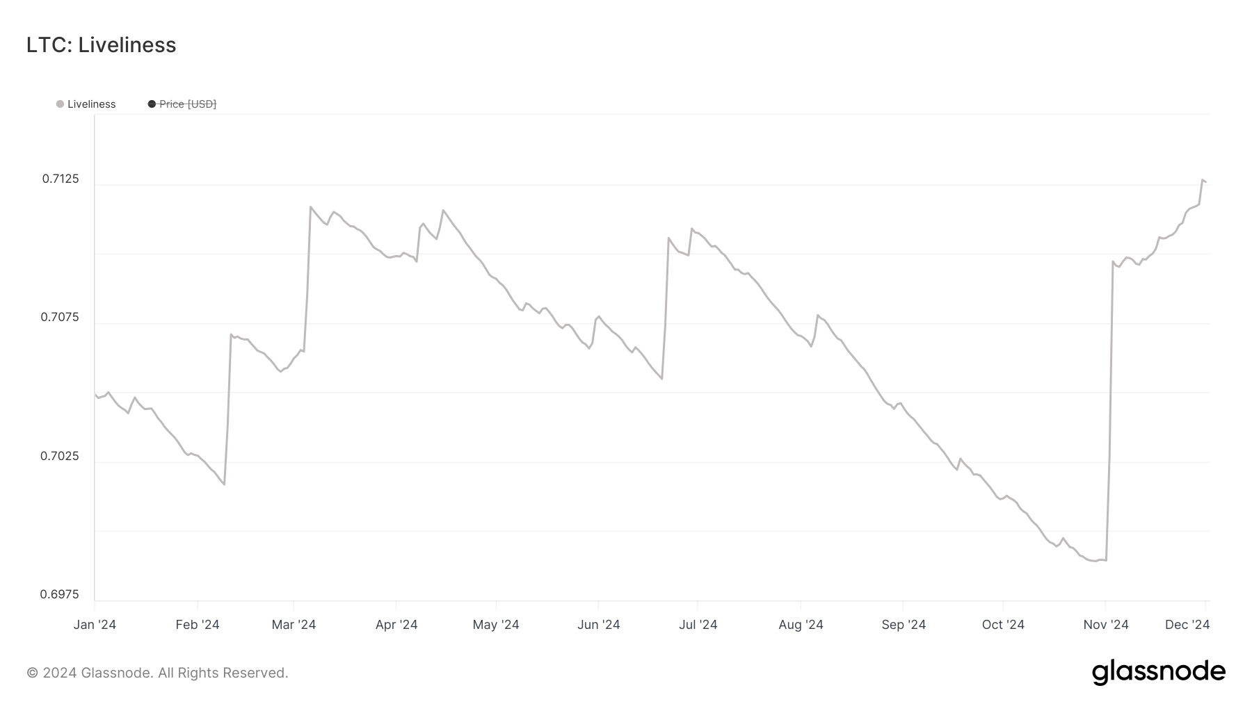 :تقييم BeInCrypto على السلسلة لمقياس الحيوية لـ LTC كشف عن ارتفاع في عدد العملات التي تم نقلها أو إنفاقها مؤخرًا. وفقًا لـ Glassnode، يبلغ حاليًا أعلى مستوى له منذ بداية العام عند ٠,٧١. للسياق، اعتبارًا من ١ نوفمبر، انخفضت حيوية LTC إلى أدنى مستوى لها منذ بداية العام عند ٠,٦٩.