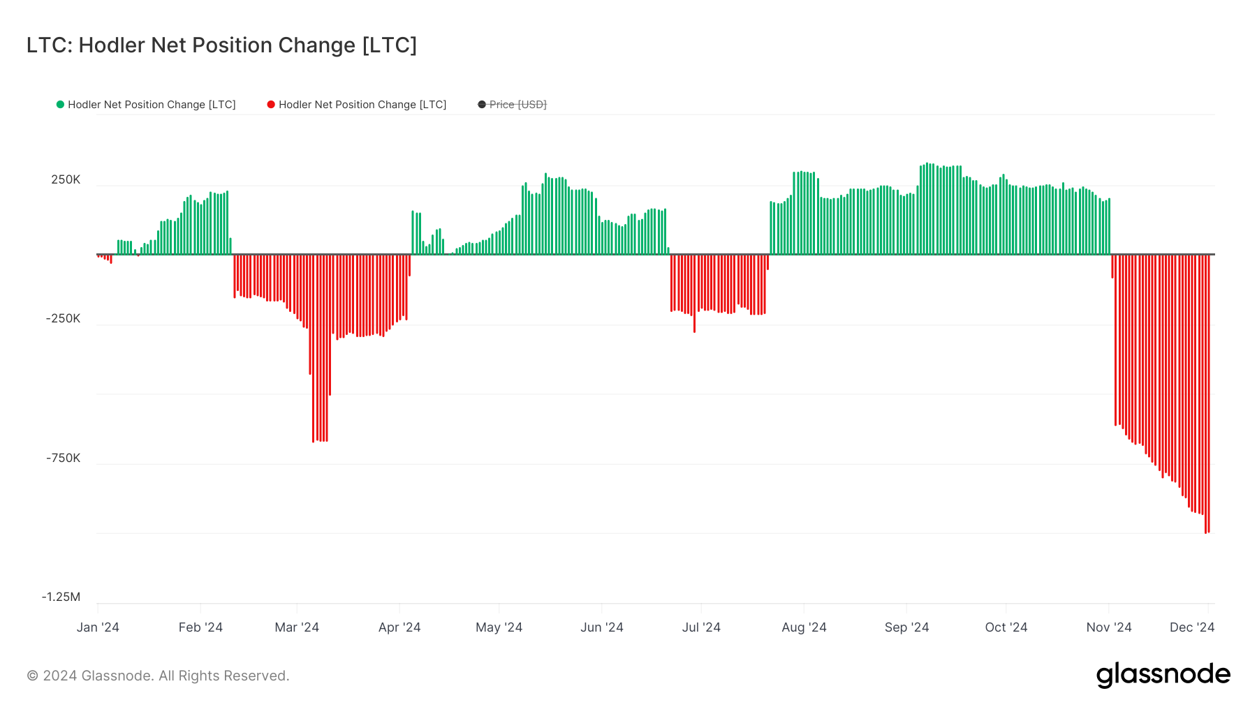 :تؤكد القراءات السلبية من تغيير صافي موقف حاملي LTC هذا الاتجاه التوزيعي بين حامليها على المدى الطويل. هذا المقياس، الذي يتتبع أيضًا سلوك حاملي العملات على المدى الطويل، أظهر فقط قيمًا سلبية منذ ٢ نوفمبر. في الواقع، في ١ ديسمبر، أغلق عند أدنى مستوى له منذ بداية العام عند -٩٩٣,١٩٩.