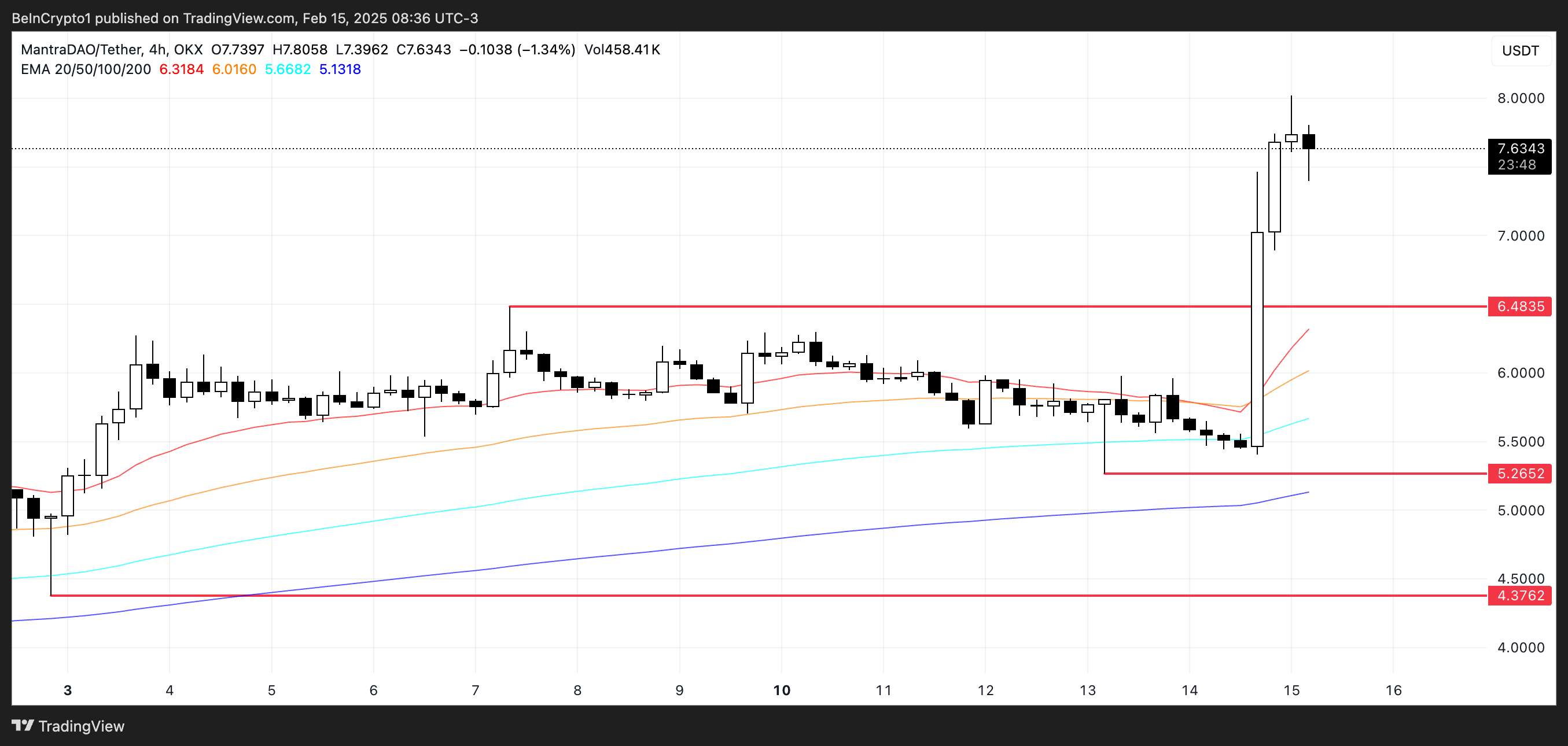 ارتفع سعر مانترا (OM) بأكثر من 35% في الـ24 ساعة الماضية، ليصل إلى أعلى مستوى له على الإطلاق فوق 7 دولارات. مع هذا الارتفاع، ارتفعت القيمة السوقية لـOM إلى 7,3 مليار دولار، متجاوزة ONDO كواحدة من أكبر رموز الأصول الحقيقية (RWA).