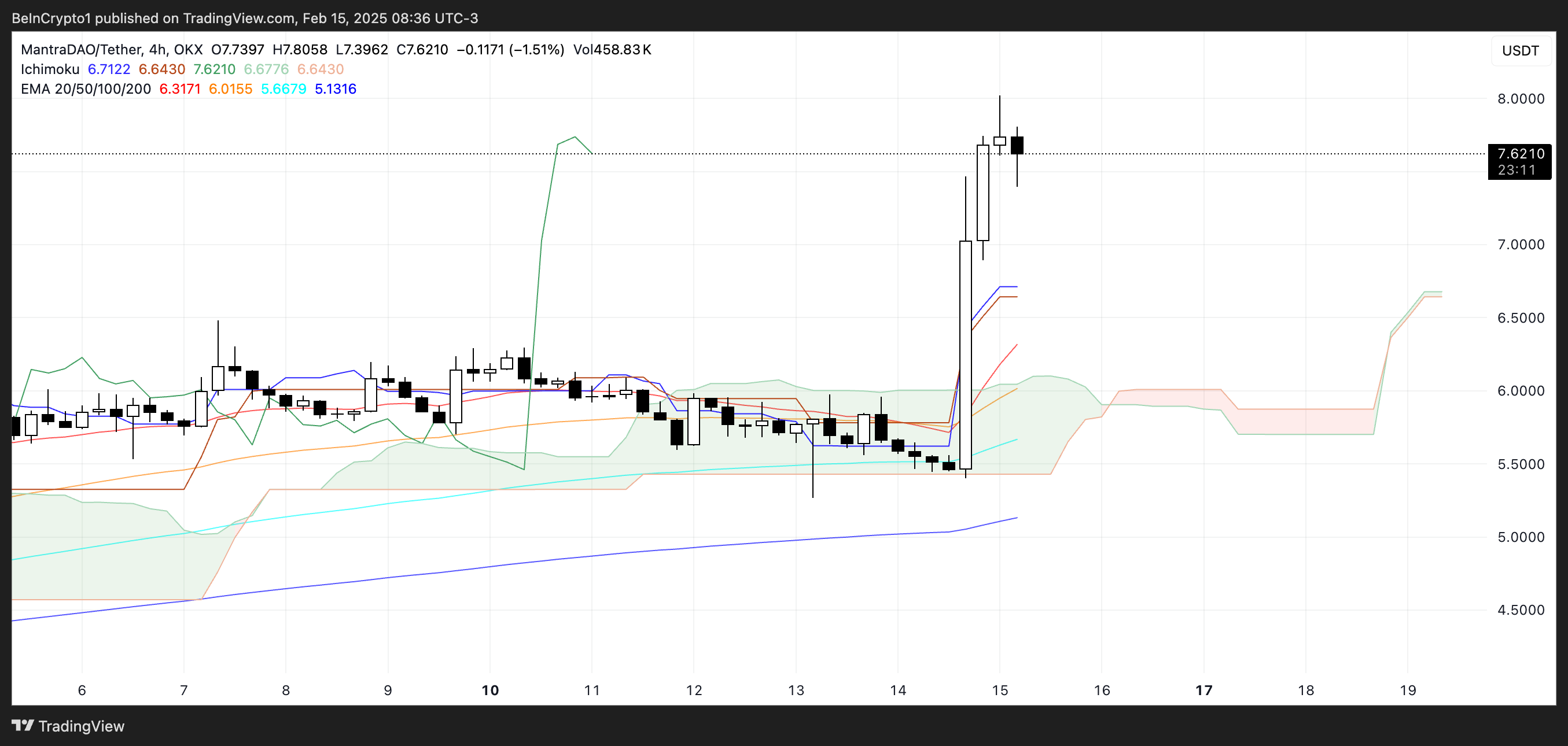 تشير هذه الخطوة إلى تحول كبير في الزخم حيث انتقل سعر OM من فترة من التماسك إلى ارتفاع قوي. يشير الانفصال عن السحابة إلى أن الزخم الصعودي يسيطر بقوة، دون وجود علامات ضعف فورية.