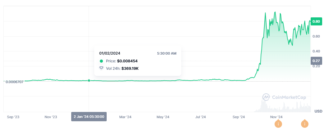 تعتبر إيثريوم أكبر موطن لعملات الميم وتستضيف القادة دوجكوين وشيبا إينو. ومع ذلك، كان الرمز البارز في هذه السلسلة هو SPX6900 (SPX)، الذي نما بنسبة 9,362% في العام حتى الآن.