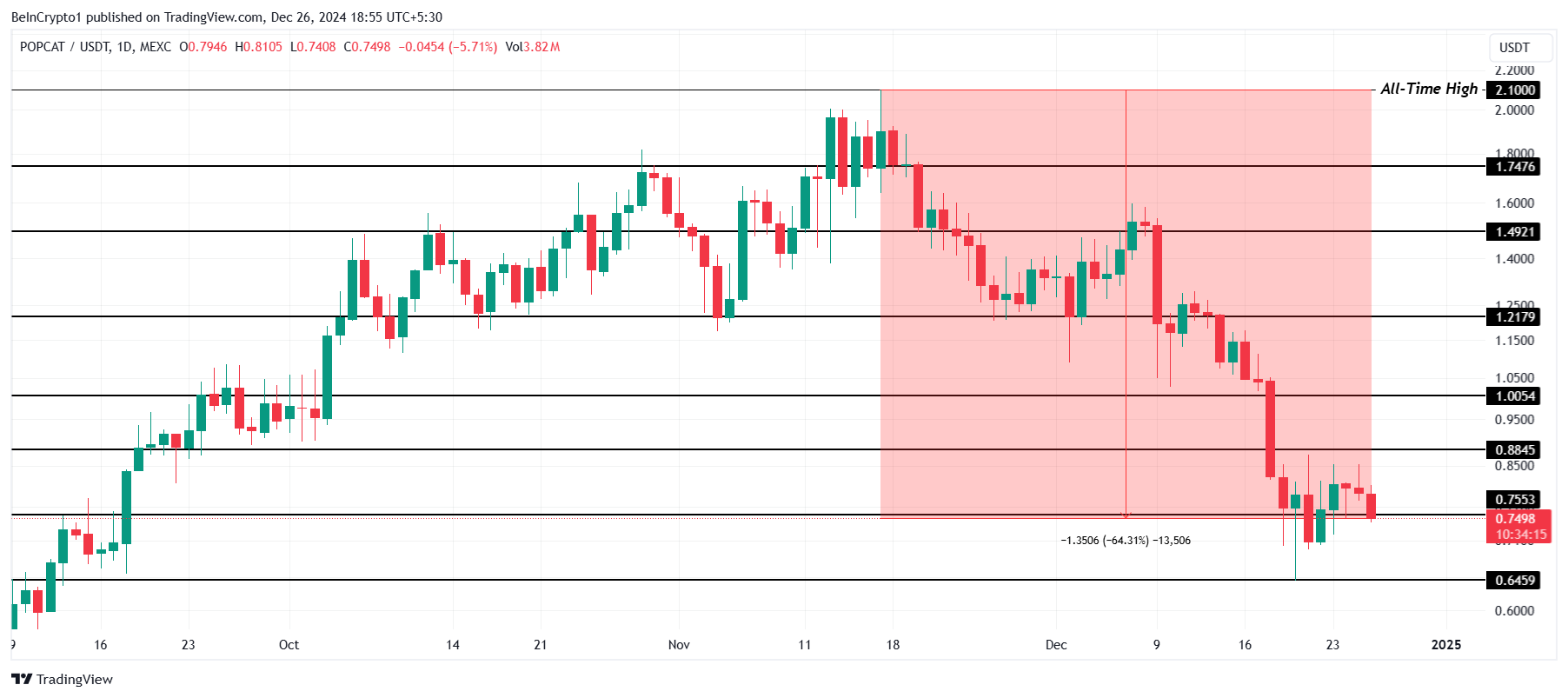 تمكن POPCAT من الارتفاع إلى $2,10 نحو منتصف نوفمبر، مسجلاً أعلى مستوى جديد. ومع ذلك، منذ ذلك الحين، لم تكن عملة الميم تؤدي بشكل جيد، حيث انخفضت بنسبة 64% لتتداول عند $0,74 في الوقت الحالي.