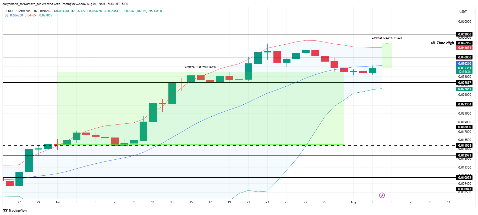 تتداول PENGU حاليًا عند $0,035، بعيدًا بنسبة 33% عن أعلى مستوى لها على الإطلاق (ATH) وهو $0,046. مع تقارب نطاقات بولينجر، تستعد العملة الميمية لانفجار في التقلبات.