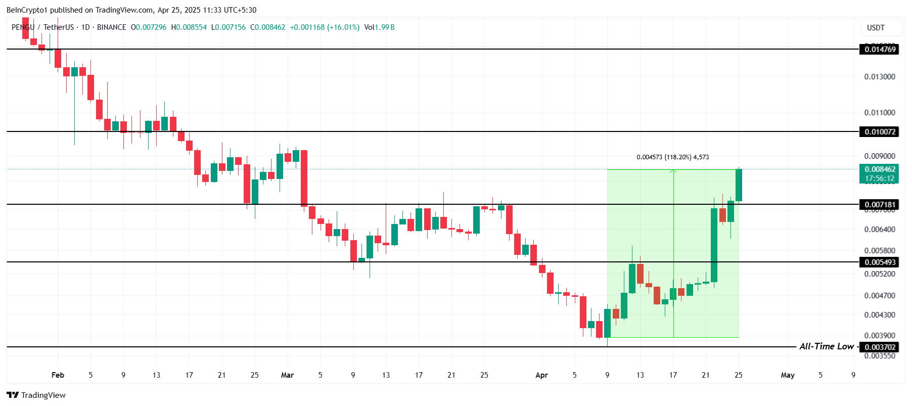 شهدت بينجو تقلبات كبيرة منذ يناير، مع تراجعات ضخمة بعد الاهتمام المبكر. ومع ذلك، ارتدت العملة الميمية بشكل حاد، حيث ارتفعت بنسبة 118% خلال الأسبوعين الماضيين. هذا التعافي جذب انتباه المستثمرين، مما أعاد إشعال الآمال في مزيد من النمو وتجديد الزخم في سعر العملة البديلة.