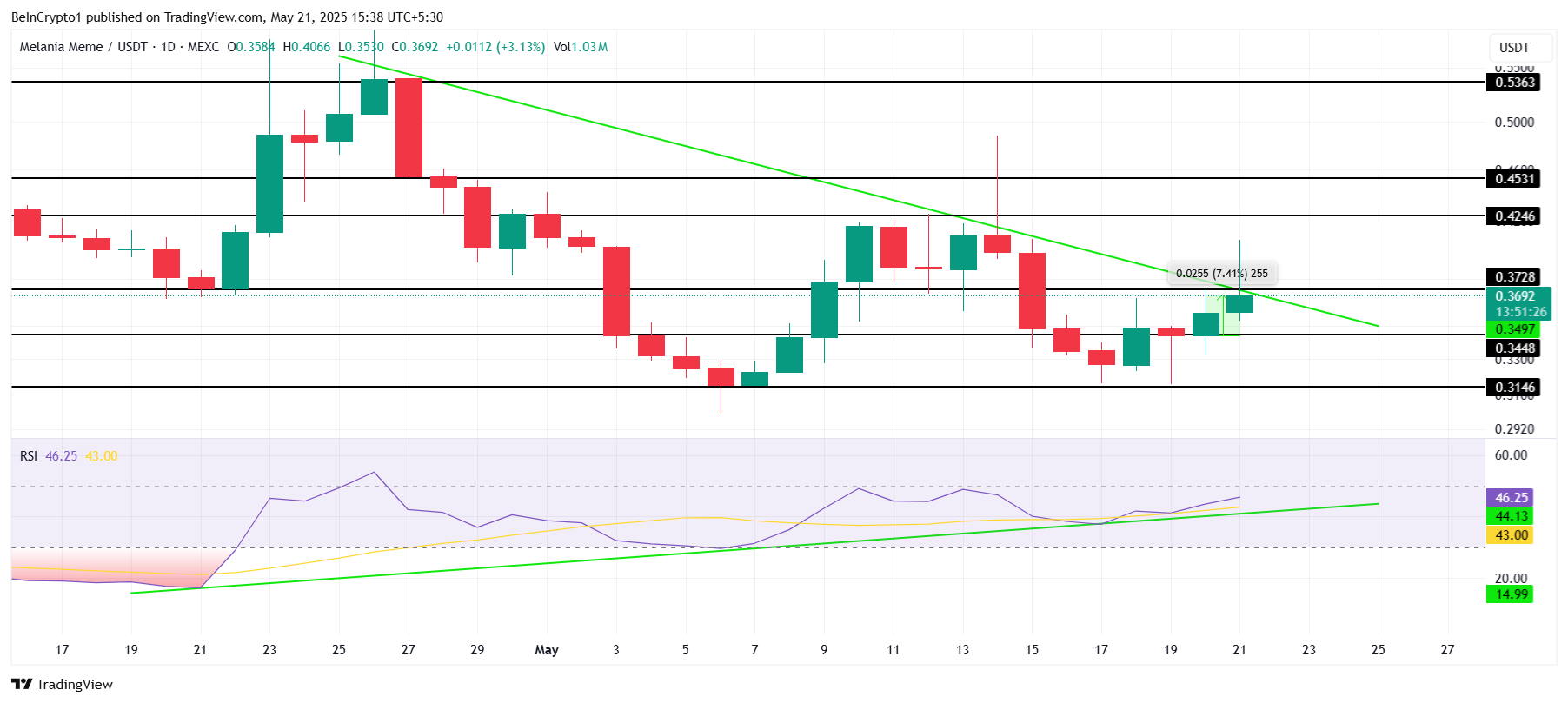 العملة الميمية تشكل تباينًا صعوديًا في مؤشر القوة النسبية (RSI)، مما يشير إلى حركة صعودية محتملة. وهذا يشير إلى أن MELANIA قد تكسر مستوى المقاومة 0,37 دولار، وتواصل ارتفاعها وربما تصل إلى 0,42 دولار. تشير حركة السعر إلى تزايد التفاؤل بين المستثمرين، الذين يتوقعون مزيدًا من الزخم الصعودي بناءً على الاتجاهات الأخيرة.