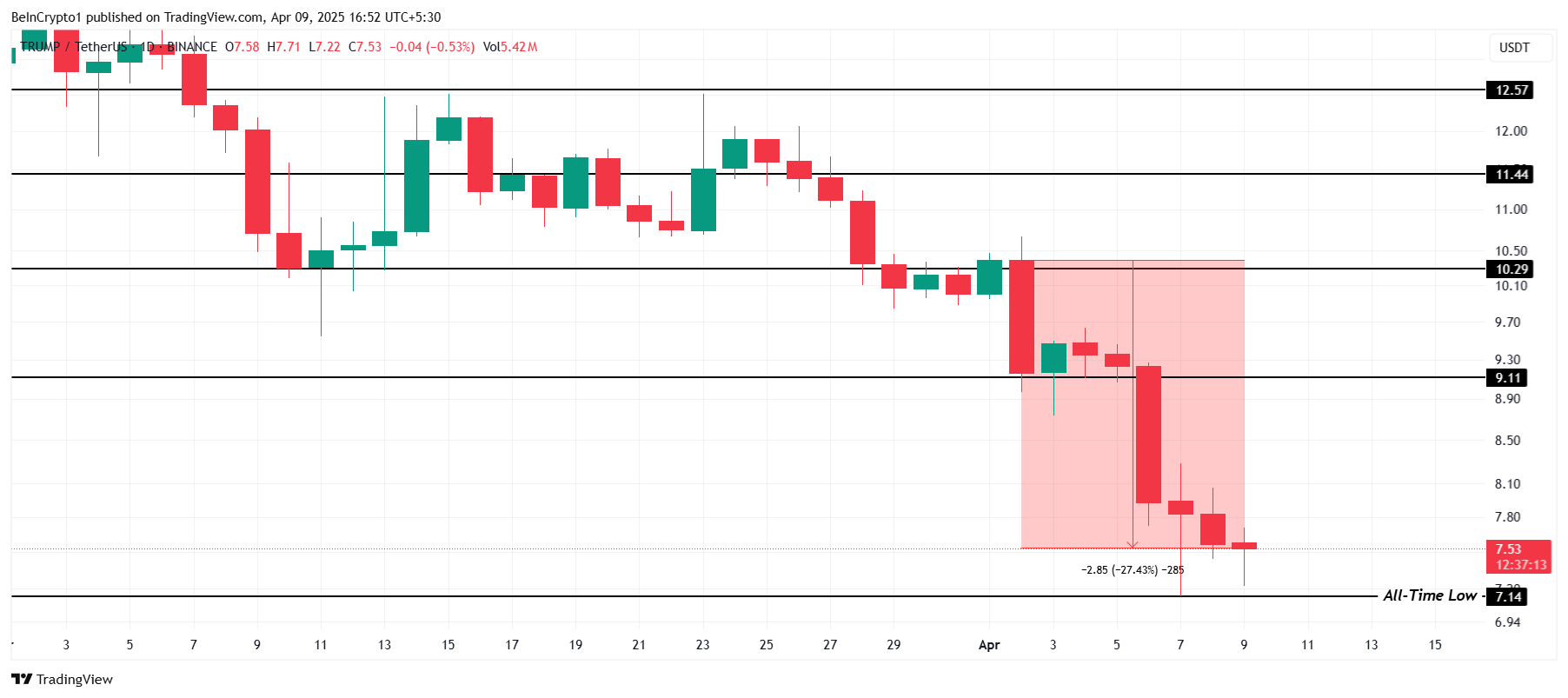 شكلت العملة الميمية مؤخرًا أدنى مستوى لها على الإطلاق (ATL) عند $7,14 قبل 48 ساعة وتتداول حاليًا بالقرب من هذا المستوى عند $7,53. إذا استمر الاتجاه الهبوطي الحالي، فقد ينخفض رمز OFFICIAL TRUMP أكثر، مما قد يصل إلى ATL جديد عند $7,00 أو أقل، مما يواصل الخسائر.