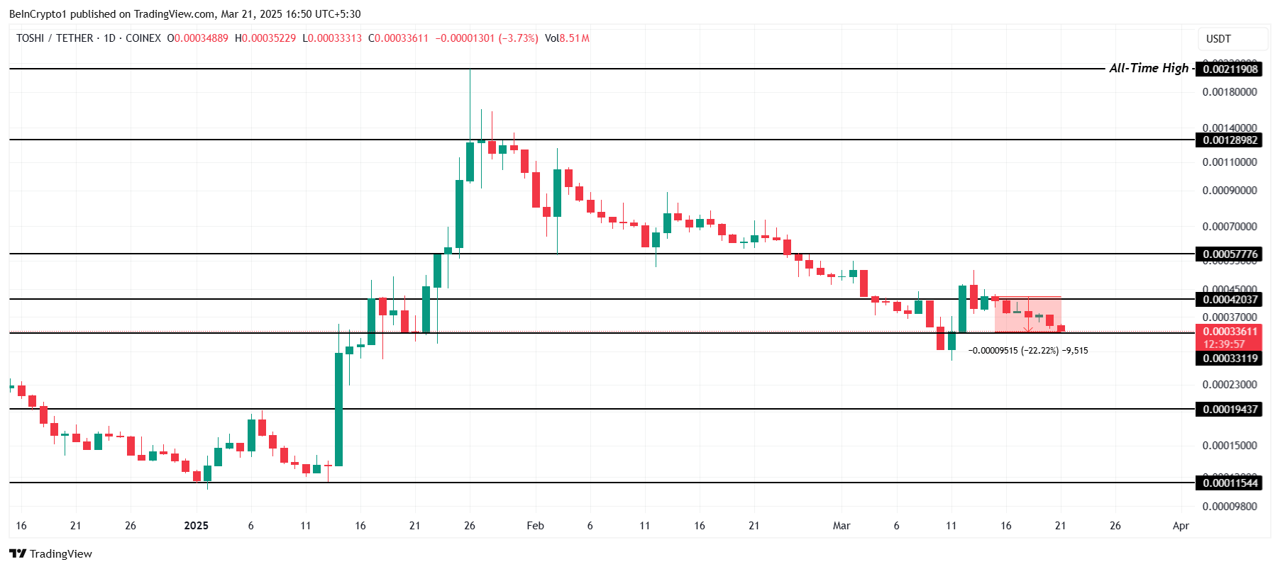 إذا استمر الزخم الهبوطي، فإن TOSHI تخاطر بالهبوط تحت دعم $0,000331، مما قد يصل إلى $0,000194. سيؤدي الانخفاض إلى هذا المستوى إلى خسائر كبيرة للمستثمرين وقد يشير إلى شعور هبوطي أعمق في السوق.