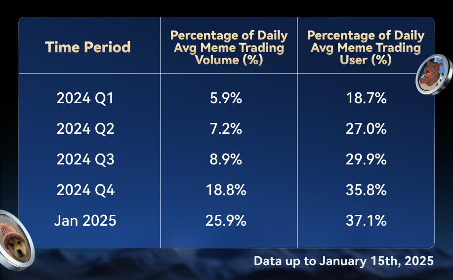 كما ارتفعت نسبة المستخدمين النشطين يوميًا الذين يتداولون عملات الميم إلى 35.8%، في حين تضاعفت نسبة متوسط حجم التداول اليومي لتصل إلى 18.8%.