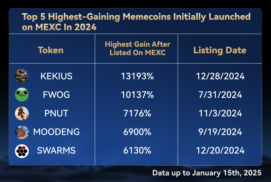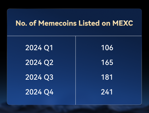 أظهرت MEXC قيادة قوية في السوق خلال الربع الرابع من عام 2024 من خلال تركيز استراتيجي على قطاع عملات الميم، حيث نجحت في إدراج أكثر من 240 مشروع ميم عالي الجودة على منصتها.