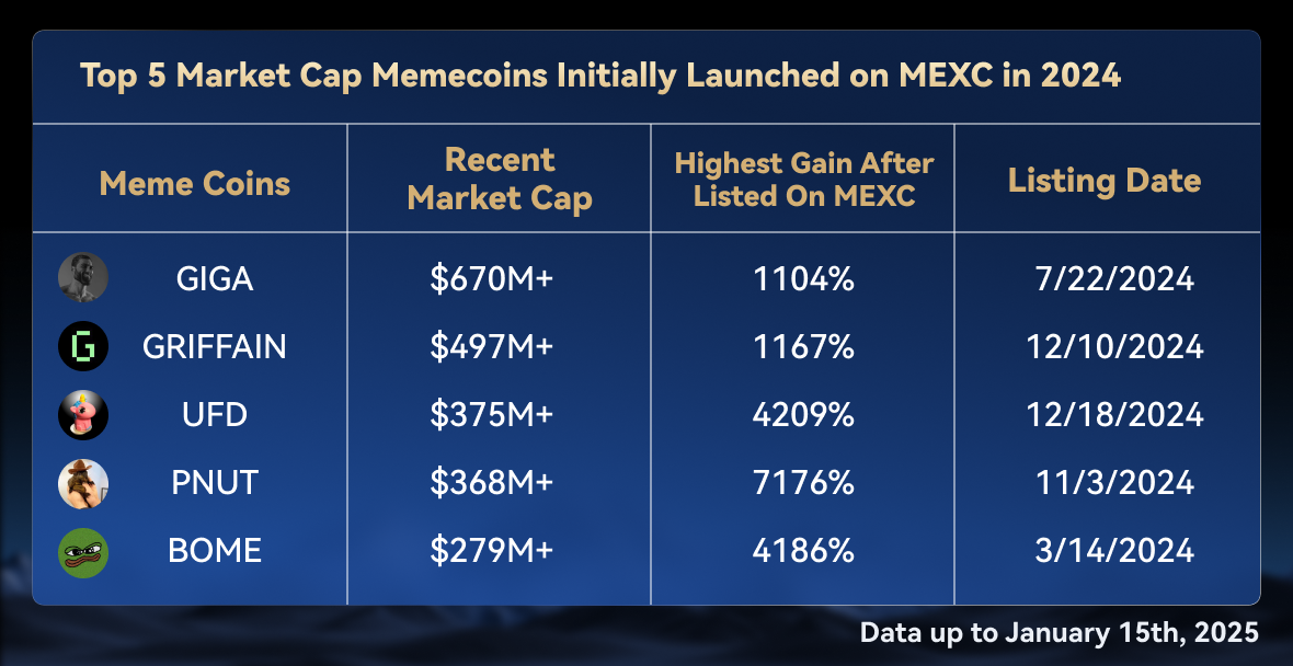 أظهرت MEXC قيادة قوية في السوق خلال الربع الرابع من عام 2024 من خلال تركيز استراتيجي على قطاع عملات الميم، حيث نجحت في إدراج أكثر من 240 مشروع ميم عالي الجودة على منصتها.