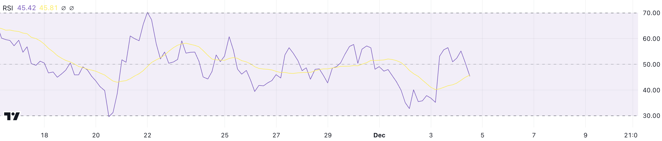 عند 45، يشير مؤشر القوة النسبية لموج إلى سوق متوازن، مع إمكانية لأي من الجانبين للسيطرة. إذا استأنف الاهتمام بالشراء، يمكن أن يرتفع مؤشر القوة النسبية مرة أخرى، مما قد يدفع السعر للأعلى، ولكن الضعف المستمر قد يؤدي إلى مزيد من التماسك أو تراجع طفيف.