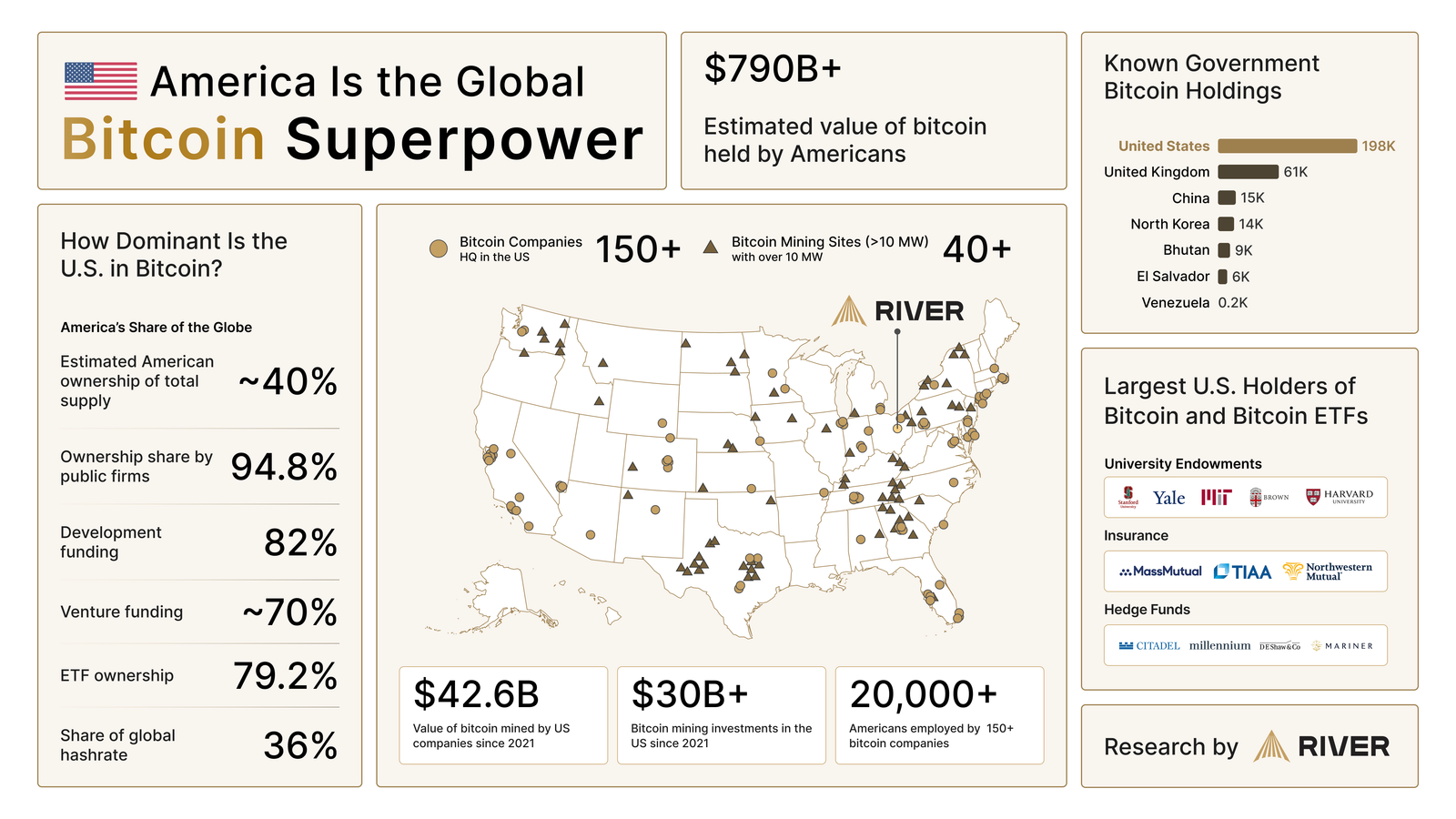 “بيتكوين هو ركيزة غير مقدرة للهيمنة الأمريكية. الأمريكيون لديهم حصة أكبر مقدرة من إمدادات البيتكوين مقارنة بالثروة العالمية، أو الناتج المحلي الإجمالي، أو احتياطيات الذهب.” صرحت River River