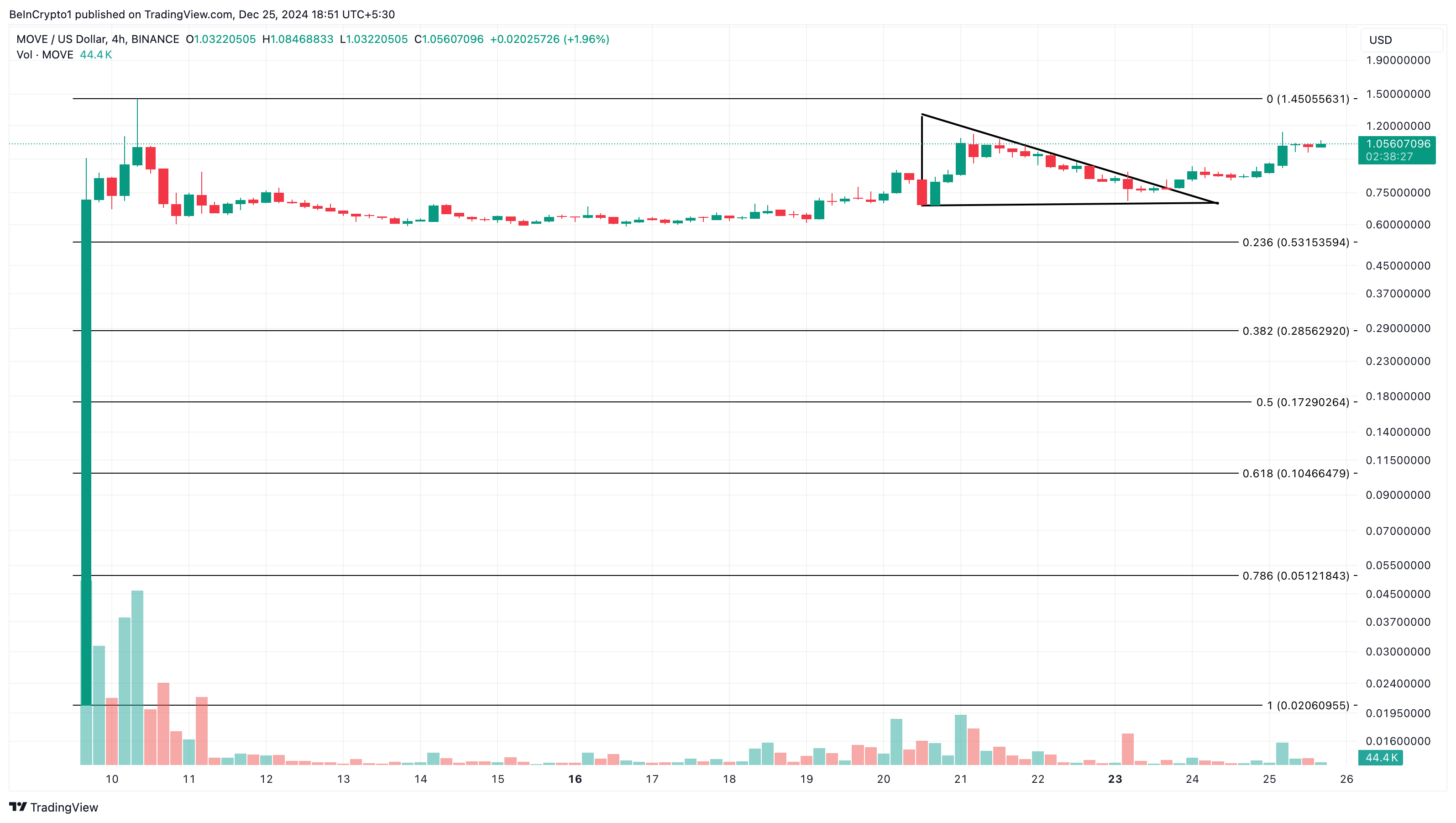 في 24 ديسمبر، كان سعر رمز MOVE $0,84. اعتبارًا من كتابة هذا التقرير، تجاوزت السعر $1. يرتبط هذا الارتفاع في السعر بالزيادة الكبيرة في حجم العملة الرقمية. في وقت ما أمس، كان حجم MOVE حوالي 830 مليار دولار.