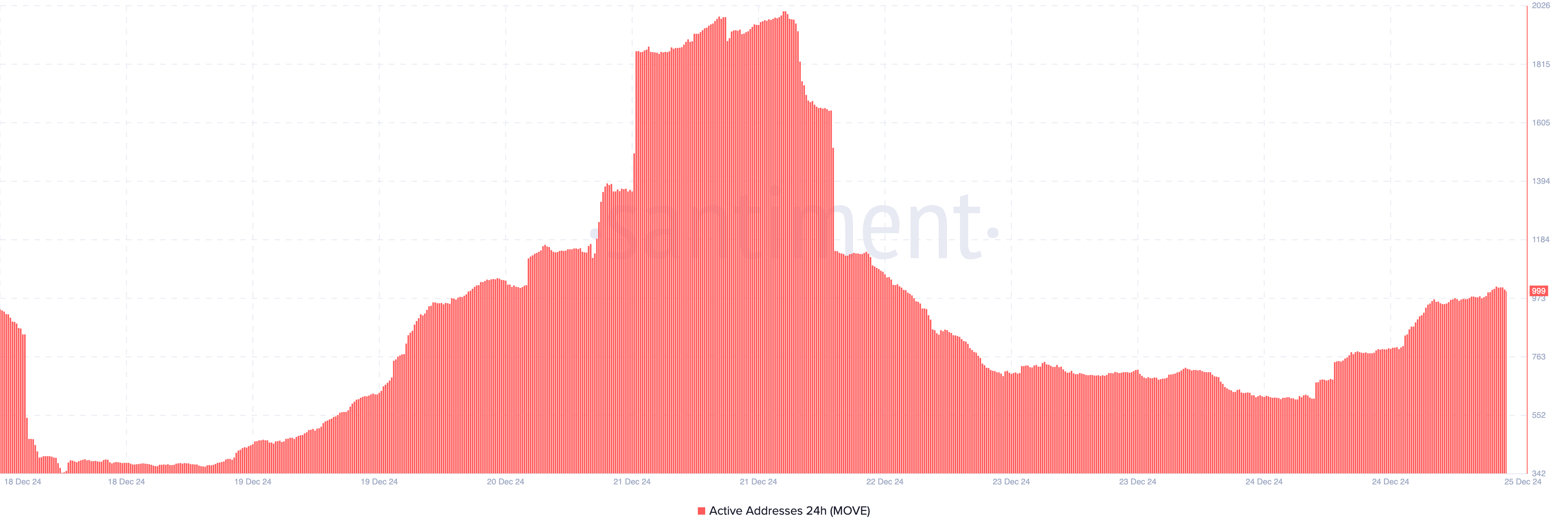 على العكس، يشير الانخفاض إلى تقليل النشاط في المعاملات على البلوكشين. وفقًا لـSantiment، ارتفعت العناوين النشطة لـMOVE خلال 24 ساعة. إذا استمر هذا الاتجاه، فقد يستمر سعر العملة الرقمية البديلة في الارتفاع.