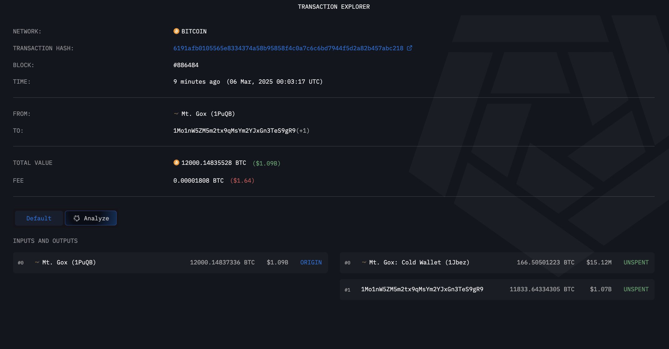 أرسلت Mt. Gox 11٬833٬6 BTC، بقيمة تقارب 1 مليار دولار، من محفظتها (1PuQB) إلى عنوان جديد (1Mo1n). بالإضافة إلى ذلك، نقلت 166٬5 BTC، بقيمة ١٥٬١ مليون دولار، إلى محفظتها الباردة (1Jbez). لم يحدث أي حركة أخرى بعد هذه الصفقات.