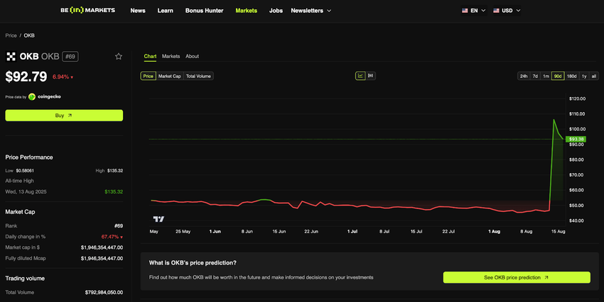 أدى الإعلان إلى ارتفاع سعر OKB من 46 دولارًا إلى أعلى مستوى له على الإطلاق عند 142,88 دولارًا في غضون ساعة. أدى التخفيض الكبير في العرض إلى تعزيز الارتفاع، وتوقعات الاستخدام الأوسع عبر نظام OKX البيئي دفعت الأسعار أيضًا إلى الأعلى. في وقت كتابة هذا التقرير، يتم تداول OKB عند 92,78 دولارًا، بانخفاض 6,93 دولارًا (-6,95%) خلال الـ 24 ساعة الماضية.