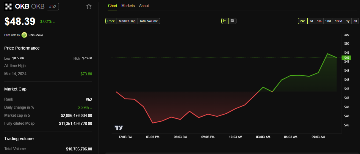 بيانات BeInCrypto تظهر أن رمز OKB الخاص بـOKX كان يتداول بسعر 48,39$ في وقت كتابة هذا التقرير. يمثل هذا ارتفاعًا طفيفًا بحوالي 3% منذ افتتاح جلسة الثلاثاء.