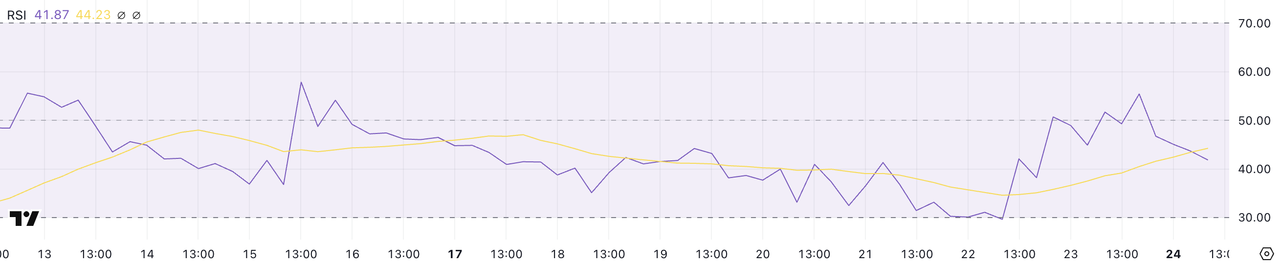 مؤشر القوة النسبية فوق 70 يشير إلى أن الأصل مبالغ في شرائه، مما يشير إلى ضغط بيع محتمل. في حين أن مؤشر القوة النسبية أقل من 30 يشير إلى أنه مبالغ في بيعه، مما قد يشير إلى فرص شراء. يعتبر مؤشر القوة النسبية بين 30 و70 عمومًا محايدًا، مما يعكس تقلبات السوق العادية.