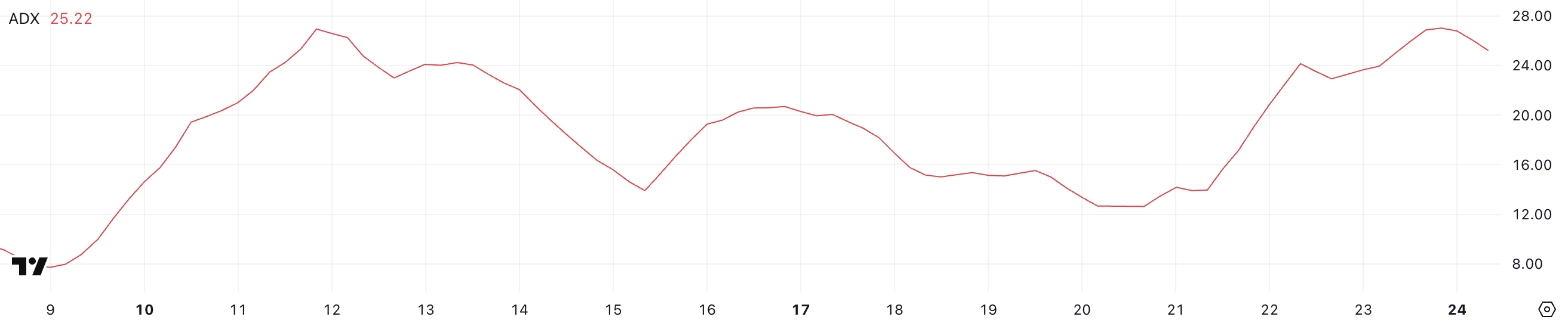 Sponsoredيشير ADX أقل من 20 إلى اتجاه ضعيف أو غير موجود، بينما تشير قيمة أعلى من 25 إلى اتجاه قوي. يؤكد ارتفاع ADX على زيادة قوة الاتجاه، بغض النظر عما إذا كان السعر يتحرك صعودًا أو هبوطًا.