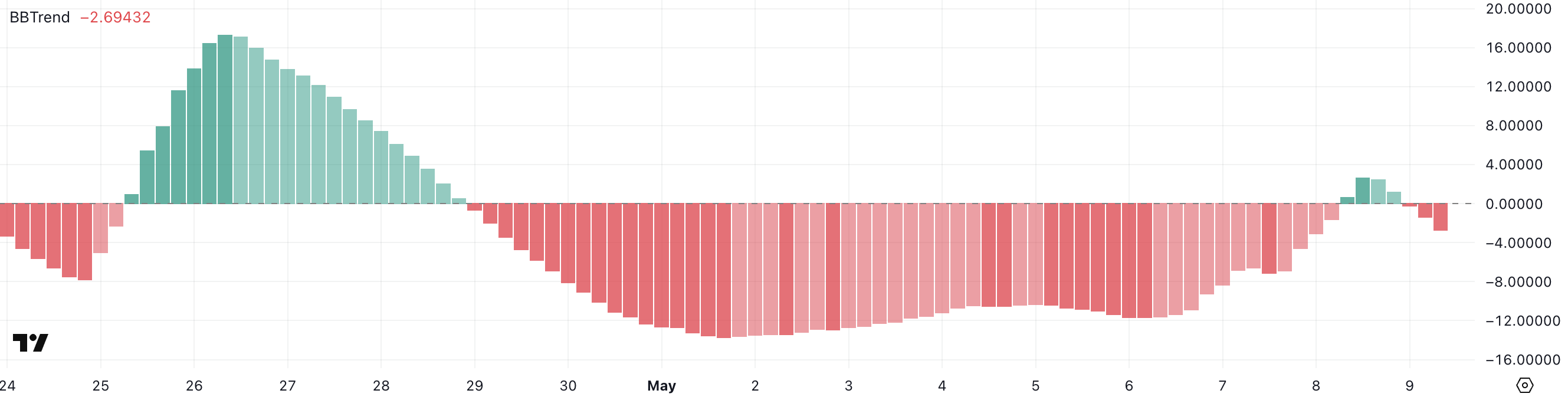 مؤشر BBTrend لأونيكسكوين حاليًا عند -2,69، مما يعكس ضعفًا متجددًا في الزخم بعد تعافي قصير. بين 29 أبريل و8 مايو، بقي مؤشر BBTrend سلبيًا، مشيرًا إلى تحيز هبوطي خلال تلك الفترة.
