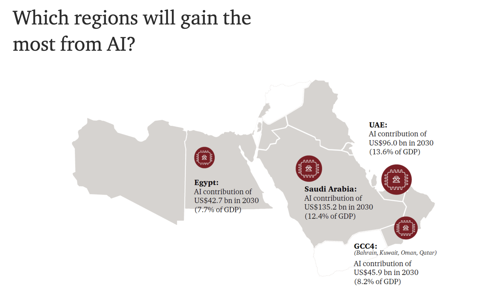 كما يشير تقرير برايس ووترهاوس كوبرز أيضًا إلى أن السعودية ستشهد أكبر مكاسب مطلقة من الذكاء الاصطناعي بحلول عام 2030، مع إضافة ما يقدر بـ 135٬2 مليار دولار أمريكي إلى اقتصادها، أو 12٬4٪ من الناتج المحلي الإجمالي. ومع ذلك، من حيث نسبة الناتج المحلي الإجمالي، من المتوقع أن تشهد الإمارات التأثير الأكبر، حيث تقترب من 14٪ من ناتجها المحلي الإجمالي لعام 2030. وفي الوقت نفسه، بالنسبة لدول مجلس التعاون الخليجي البحرين، الكويت، عمان، وقطر، من المتوقع أن يساهم الذكاء الاصطناعي بنسبة 8٬2٪ من ناتجها المحلي الإجمالي.