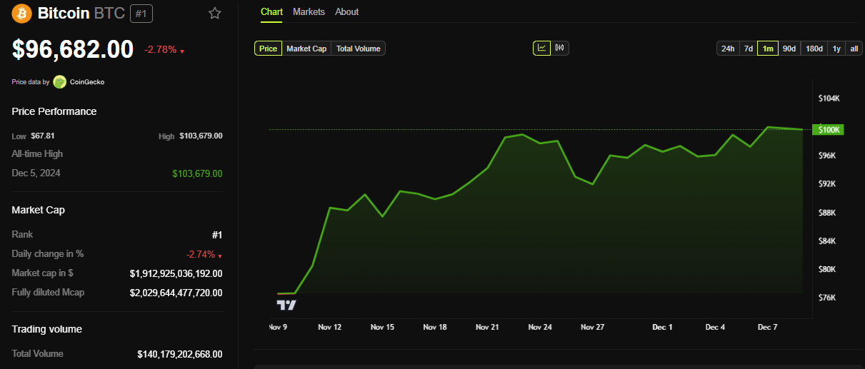 تظهر بيانات BeInCrypto أن بيتكوين كان يتداول بسعر 96,682 دولار في وقت كتابة هذا التقرير، بانخفاض يقارب 3% منذ افتتاح جلسة الثلاثاء.