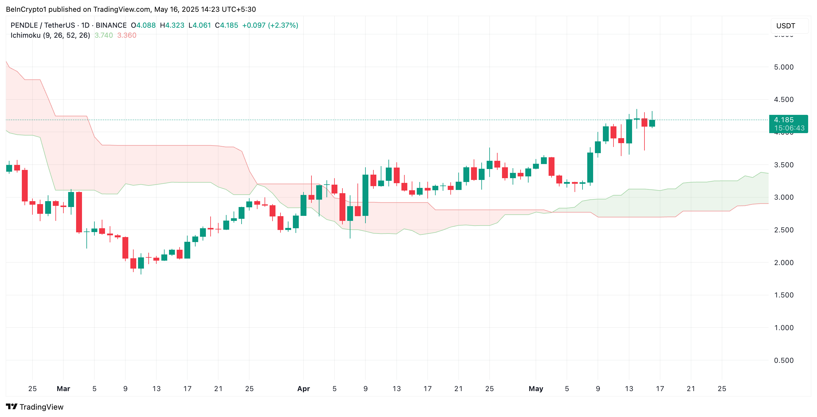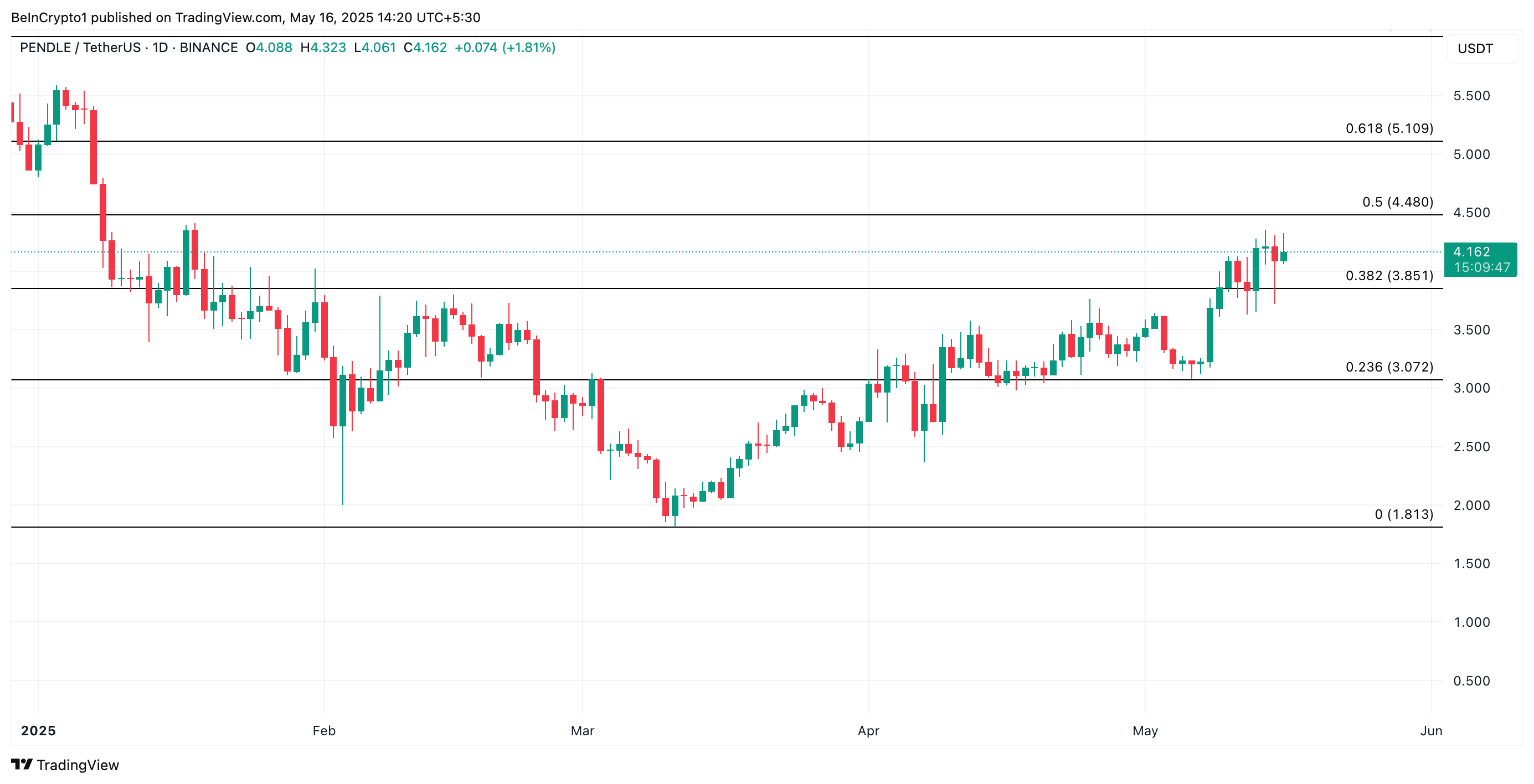تم تداول PENDLE داخل قناة موازية صاعدة منذ 11 مارس، مما يعكس ارتفاع سعرها على مدى الشهرين الماضيين. في وقت النشر، تتداول العملة البديلة عند $4,16، مرتفعة بنسبة 135% من أدنى سعر $1,81.