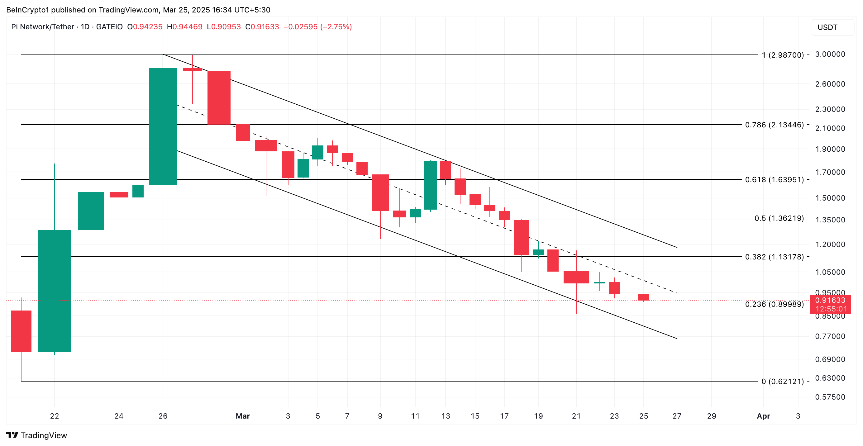 علاوة على ذلك، ظلت PI في قناة موازية هابطة، وهو نمط يعكس اتجاهها الهبوطي. وفقًا للقراءات من مخطط PI/USD اليومي، تم تداول PI ضمن هذا النمط الهبوطي منذ الوصول إلى أعلى مستوى له على الإطلاق عند 3$ في 26 فبراير.