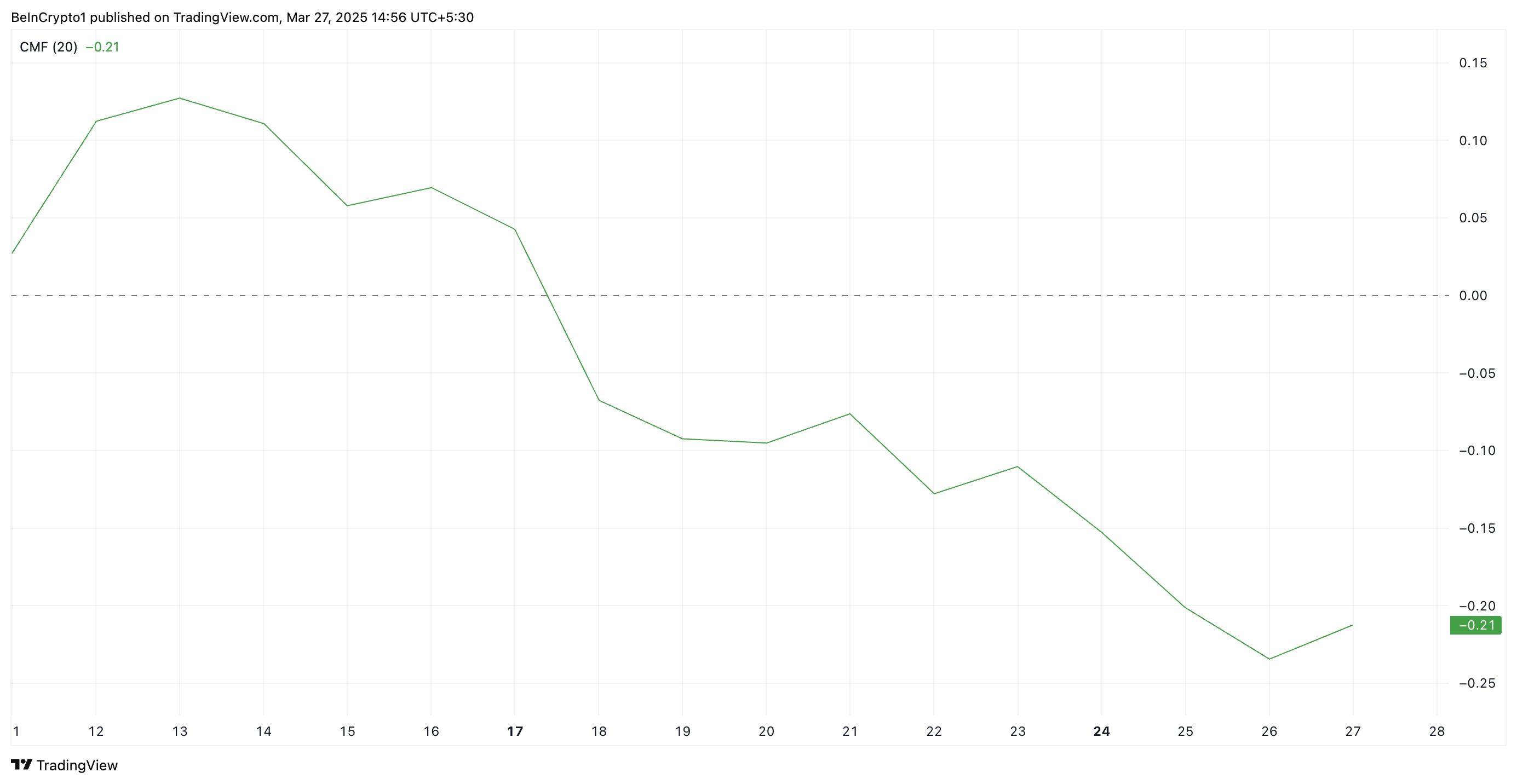 عندما ينخفض مؤشر CMF للأصل ويهبط تحت الصفر، فإنه يشير إلى ضعف ضغط الشراء وزيادة زخم البيع. يشير ذلك إلى أن رأس المال يتدفق خارج PI حيث يكثف المتداولون جهود جني الأرباح، مما يزيد من انخفاض سعره.